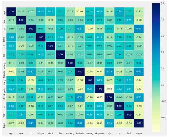 Figure 4 displays the heat map that illustrates how characteristics of the heart disease datasets were related to one another. Here, the values on the two-dimensional surface are shown using various hues. It is clear that qualities with a categorical value were more concentrated than those with a continuous value.