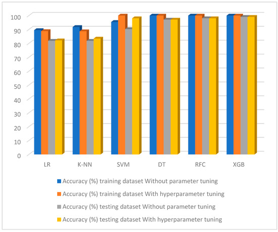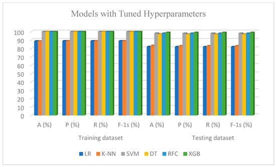 The suggested method used GridSearchCV to find the ideal hyperparameters. After the hyperparameters were modified, the classifying models were constructed. For both the training and test datasets for each of the six machine learning methods, Figure 7 shows the outcomes of the suggested system with tuned hyperparameters in terms of the accuracy, precision, recall, and F-1 score. The details of the Figure 5 findings are given in Appendix A, Table A2.