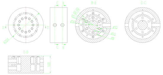 Incurve multiple-acting pump is a six-acting eight-piston structure. Each piston completes six times of suction of raw seawater, pressurization of raw seawater, recovery of pressure energy of high-pressure concentrated seawater, and discharge of concentrated seawater after work. In order to satisfy the flow distribution of raw seawater and thick seawater with eight pistons for six times in a cycle, the double-layer flow distribution plate structure is newly designed. As shown in Figure 2, the first layer is the pressurized raw seawater channel and high-pressure concentrated seawater channel, and the second layer is the inhaled raw seawater channel and the worked concentrated seawater channel. The contact surface with the rotor forms a U-shaped waist.
