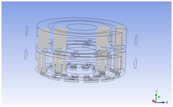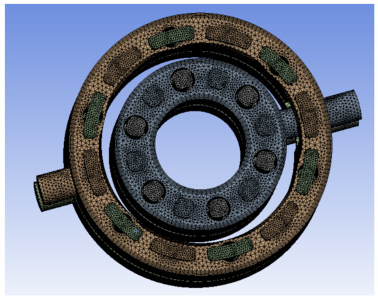 Commercial CFD software ANSYS was used as the simulation platform. A pressure-based solver was chosen to solve the governing equations, and a coupled algorithm was used for pressure-velocity coupling. The spatial discrete scheme was gradient least squares element method, pressure second order, momentum second order upwind scheme, and modified turbulence viscous second order upwind scheme. The realizable k-ε model was used for the turbulence model, and the spatial small unit size was 0.2 mm. The ANSYS meshing module was used to mesh the fluid domain of the port plate, as shown in Figure 3. Boundary layer inflation method and local grid refinement technique were used in the fluid domain.