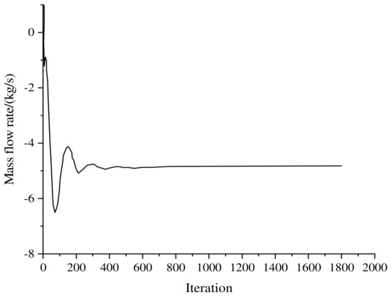 The pseudo-transient model was turned on during the numerical simulation, and the time scale was 0.01. Whether the numerical calculation converges was based on the stability of the mass flow and the calculated residual is less than 0.0001. The outlet mass flow rate was detected, as shown in Figure 4. The accuracy of numerical simulation results and the consumption of computing resources were directly affected by the number of grids, grid density and grid quality. For the numerical simulation of pseudo-transient cavitation, the influence of the number of grids on the calculation time and results was more obvious. Taking the number of grids as the independent variable and the outlet mass flow rate as the criterion, the grid independence was verified, as shown in Figure 5.