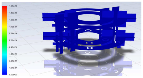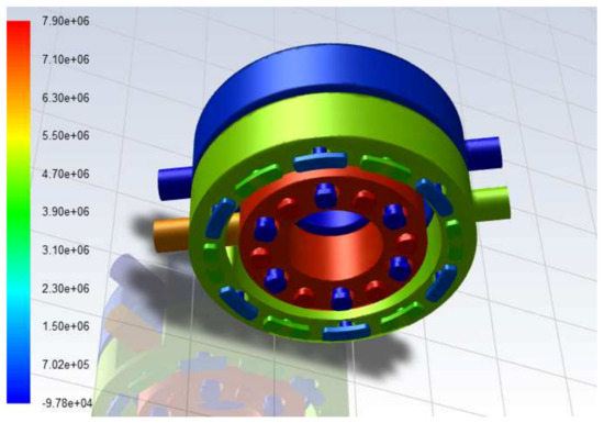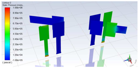 It can be seen from Figure 12 that the volume fraction of vapor inside the optimization point is 0 after the inlet velocity condition is changed, indicating that there is no cavitation inside the port plate, which is consistent with response surface in the Figure 11. Figure 13 shows the pressure field of the two cross sections of the optimized point through the Y axis. The internal pressure distribution is evenly, and there is no local pressure lower than the vapor separation pressure, which is mutually verified with Figure 12.