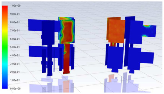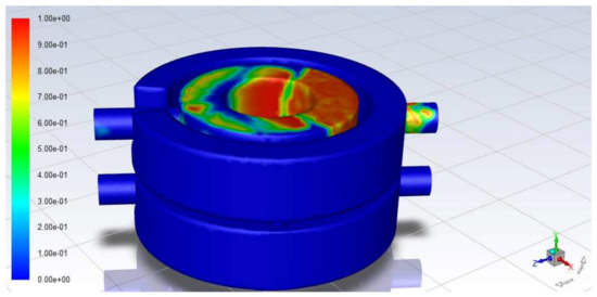 As can be seen from Figure 8, cavitation occurs in the raw seawater suction area, especially cavitation is more serious away from the raw seawater pressure inlet place, mainly due to the existence of flow resistance. The local pressure is lower than the air separation pressure of water vapor. Figure 9 shows the vapor volume distribution diagram of the two cross-sections through the Y-axis. It can be seen that the most serious part of the cavitation is located on the slender channel of the distribution port of the raw seawater. The main reason is that the hydraulic diameter of the slender pipeline is smaller than that of other raw seawater inlet basins, resulting in a higher flow rate and lower pressure.