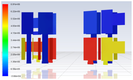 Figure 6 and Figure 7 indicate the pressure fields of the port plate, among which Figure 7 shows the detailed pressure fields of the two interfaces across the Y-axis selected in Figure 6. As can be seen from Figure 5, the overall pressure inside the port plate is divided into four areas: high-pressure raw seawater area, high-pressure concentrated seawater area, low-pressure raw seawater area and low-pressure concentrated seawater area. The overall distribution is relatively evenly. However, whether for raw seawater or concentrated seawater, the pressure at the velocity inlet is higher than that at the pressure outlet. It is mainly caused by the local resistance loss inside the port plate and the friction head loss. In particular, the pressure difference between the velocity inlet and the pressure outlet of the raw seawater reached 0.5 MPa, which was significantly higher than that of the concentrated seawater. The reason for this phenomenon is that the flow area of raw seawater is significantly smaller than that of concentrated seawater and the flow rate of concentrated seawater is only 60% of that of raw seawater. Therefore, both the local resistance loss and the friction head loss are higher than that of concentrated seawater. From the detailed pressure field in Figure 6, it can be seen that when the local pressure in the seawater suction area of the raw material reaches 10,000 pa, which is lower than the saturated vapor pressure of the seawater vapor, cavitation will occur.