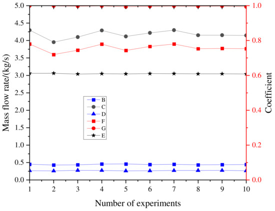 The experimental data are shown in Figure 15. Curve B represents the leakage mass flow before optimization; curve C represents the output mass flow before optimization; Curve D represents the leakage mass flow after optimization; Curve E represents the output mass flow after optimization; Curve F represents the mass flow coefficient before optimization; Curve G represents the mass flow coefficient after optimization. According to the CFD simulation results and Formula (13), the mass flow coefficient before optimization is about 74.6%, and the average experimental result is 75.4%, with good coincidence. According to the CFD simulation results and Formula (14), the mass flow coefficient before optimization is about 100%, and the average experimental result is 99.8%. The experimental results show that the CFD calculation is correct, and the optimized raw seawater pressure inlet is 0.42 MPa. The pressure of raw seawater after pre-treatment is 0.42 MPa. The inlet velocity is 7.1 m/s and the corresponding speed is 520 r/min.