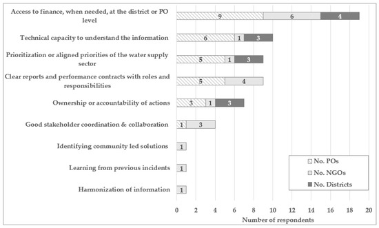 Factors respondents highlighted as critical for improvement action which could be supported by WSP implementation. PO—private operator, NGO—non-governmental organization.