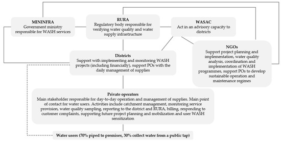 - Tsinda, A.; Abbott, P.; Chenoweth, J.; Mucyo, S. Understanding the Political Economy Dynamics of the Water, Sanitation and Hygiene (WaSH) Sector in Rwanda. Int. J. Urban Sustain. Dev. 2021, 13, 265–278. [Google Scholar] [CrossRef]