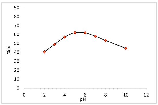 The solution’s pH is one of the essential parameters for studying the adsorption of heavy metal ions and pollutants. After shaking for 120 min at room temperature, the adsorption profile of aqueous solutions that contain Amox at various pH levels via the HAP solid phase was investigated. The quantity of Amox in the aqueous phase after equilibrium was measured using photometry [48]. The adsorption percentage %E of Amox onto HAP increases significantly with the rise in the solution pH up to 5 and then decreases with an increase in the pH, as shown in the representative data (Figure 2). The mechanism of amoxicillin absorption by hydroxyapatite can be explained by several physical processes, such as ion exchange. An exchange may occur between the hydroxyapatite and the protonated functional groups of amoxicillin, such as carboxylate, amine, and hydroxyphenyl. Since amoxicillin has a positive charge at low pH, the adsorption of amoxicillin on hydroxyapatite increases when the pH of the solution increases from 2 to 6, due to the amoxicillin charge shifting to neutral molecules. On the contrary, the absorption of amoxicillin decreases when the pH increases from 7 to 10 as a result of changing the amoxicillin charge to negative [49,50]. Subsequently, pH = 5 is chosen as the best-optimized pH value for the current research work.