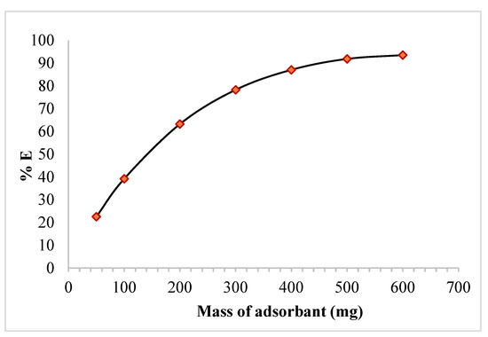 At the 30 mg/L concentration, the impact of the solid-phase HAP mass on the ratio of Amox adsorbed from the solution has been investigated (Figure 3). The figure shows that the HAP proportion eliminated from the aqueous solution ranges from 22.5% to 93.5% when the HAP dose rises from 50 mg to 600 mg. The high amount of solid phase increases the availability of more active sites for adsorption, resulting in a rise in the percentage. In this study, 200 mg of HAP, equivalent to 63.3%, were used to observe the influence of other parameters on adsorption.