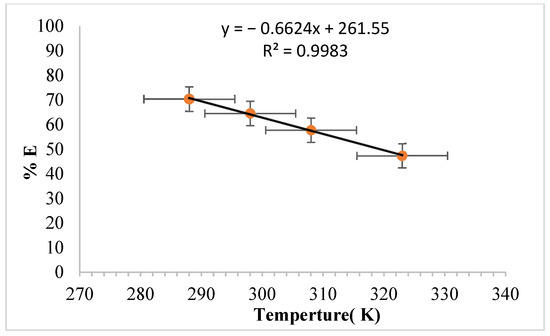 Effects of temperature on the percentage of Amox removal from solutions onto (0.2 ± 0.01 g) HAP at 288, 298, 308, and 323 K; pH 5; shaking time 120 min.