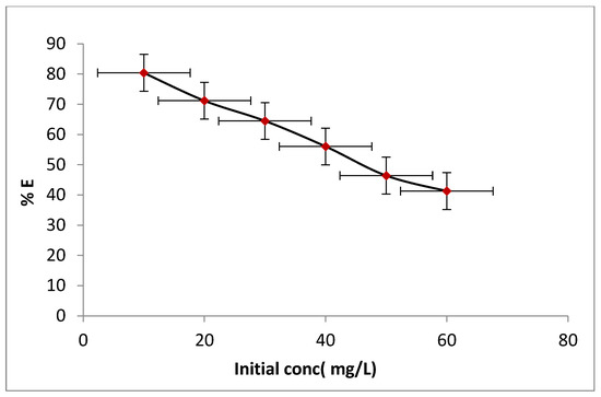 The retention profile of Amox from aqueous solutions with a pH of 5 is examined over a broad range of equilibrium values (10 mg/L–60 mg/L). In (Figure 6), %E of Amox species adsorbed onto HAP is shown against the corresponding concentration in the aqueous solution. More dilute aqueous solutions produce the most favorable %E of Amox adsorption onto HAP sorbent. With the rising Amox concentrations, the %E values decline, and the HAP membranes become increasingly saturated with the retained Amox species.