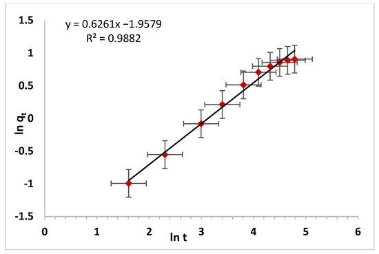 The kinetic model of a fractional power function modified from Freundlich’s equation can be represented by the following relation [55]: