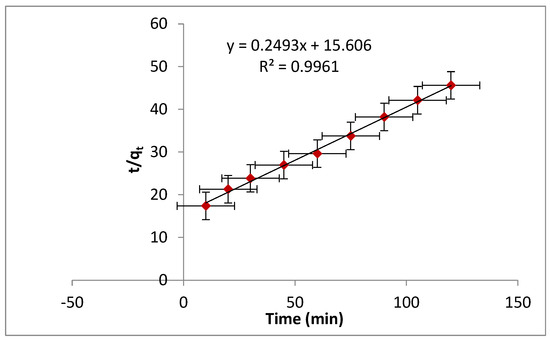 (h = k2qe2 relates to the rate of initial adsorption, and (qe and qt) denote the adsorbed quantities per unit mass at any time (t). In these conditions, (t/qt) vs. (t) plots are linear (Figure 10). The (k2) is a second-order rate constant, and the equilibrium capacity (qe) for the Amox species is computed from the intercept and slope. They are equal to (3.9 × 10−3 g) (mg. min)−1 and (4.01 mg/g), with a notable degree of correlation (R2 = 0.996). The data show that all of the experimental data fit well with the excellent agreement values and the pseudo-second-order rate constants, k2, which typically depend on the experimental conditions.