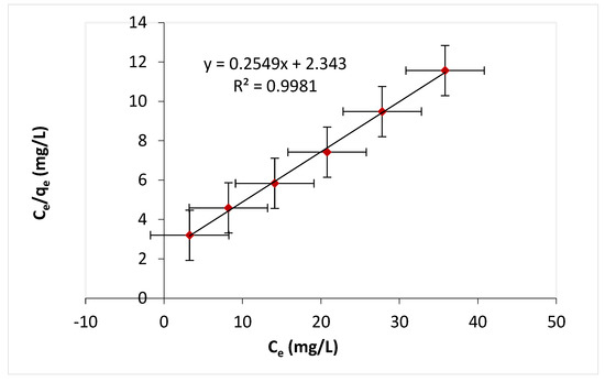 The plot of the Amox amount adsorbed onto HAP vs. the Amox concentration values in solution is depicted in (Figure 12). At moderate concentrations of the analyte, the amount of Amox retained on the HAP linearly varies with the amount of Amox that remains in the solution. A (3.10 ± 0.05 mg g−1) adsorption capacity of Amox onto HAP is achieved.