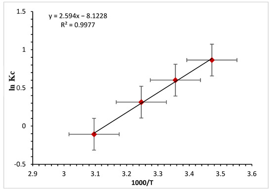 ln KC of Amox adsorption plot from an aqueous medium onto HAP vs. 1000/T.
