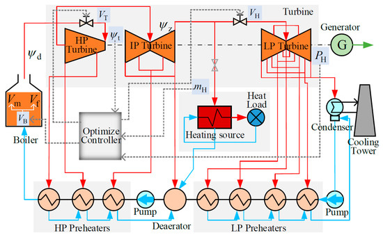 As shown in Figure 1, the CHP unit has a direct-blow pulverizing system with a medium-speed mill, one intermediate reheat, a condensing steam turbine, and a condensing feed water system with three HP preheaters, four LP preheaters, and one deaerator [24]. This CHP unit model is derived from a mechanistic analysis including mass conservation and energy conservation and is divided into four independent parts to analyze the dynamic relationships between the building variables.