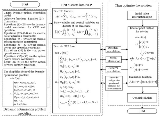 For the above CEHS dynamic optimization scheduling problem with DAE constraints, the simultaneous method [28,29,30], widely used in relevant fields, can solve the optimization proposition. The simultaneous algorithm is an idea or scheme to solve problems, and is a combination of multiple methods. It can also be called a “strategy”. The simultaneous solution strategy usually follows the fixed problem-solving mode of “all discretization and then optimization”. The solution framework of “first discrete, then optimized” is shown in Figure 2. Firstly, the control, differential, and algebraic variables are discretized simultaneously using Lagrange interpolation polynomials based on orthogonal collocation points, and a nonlinear programming (NLP) proposition is obtained. Then the proposition is solved by the interior point method and other optimization algorithms. The simultaneous method has significant advantages in dealing with the optimal problem with complex constraints. This method combines the solution of the DAE model with the optimization problem. It only needs to solve the DAE once to avoid many calculations in the middle process [29].