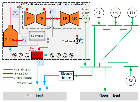 In order to improve the electrical output flexibility of CHP units, researchers have extensively studied CHP units in CEHS and explored their dispatch flexibility potential. On the one hand, the CHP unit is retrofitted with a direct decoupling scheme by adding equipment through physical modifications. In [5,6], the optimal scheduling strategy of CEHS containing electric boilers was studied to verify the impact of coordinated heat supply from electric boilers on wind and coal abandonment. Literature reports [7,8] used heat storage devices to break the thermoelectric coupling relationship of “determined power by heat” and analyzed the effects of different installation positions of heat storage devices. These transformations reduce the minimum feasible power load of the unit, thus expanding the feasible domain to improve the operational flexibility of the unit. On the other hand, existing studies have used optimal control methods to improve the short-term rapid active regulation of the unit based on the intrinsic characteristics of CHP units. This scheme is an indirect decoupling technical scheme, which can significantly change the unit’s electrical output in a short time without affecting the heat load supply. In [9,10], an optimal control strategy for CHP units is investigated to increase the maximum allowable ramping rate to more than 4% of the rated power. The rapid variable load capacity of CHP units can complement the rapid fluctuation of wind power and electric load, and make full use of the scheduling flexibility of the units, which will be beneficial to wind power consumption [11]. However, most of the current CEHS optimization scenario studies consider the effect of the direct decoupling or indirect decoupling scheme transformation on the system scheduling results independently, and less in-depth analysis of the complementary effect of the optimization scheduling flexibility when the two transformation schemes coordinate heating.