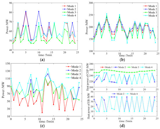 Electric and heat power output of each unit in different modes. (a) Electric power output of TP unit. (b) Electric power output of CHP unit. (c) Electric power output of WP unit. (d) Heat output power of CHP unit and EB.
