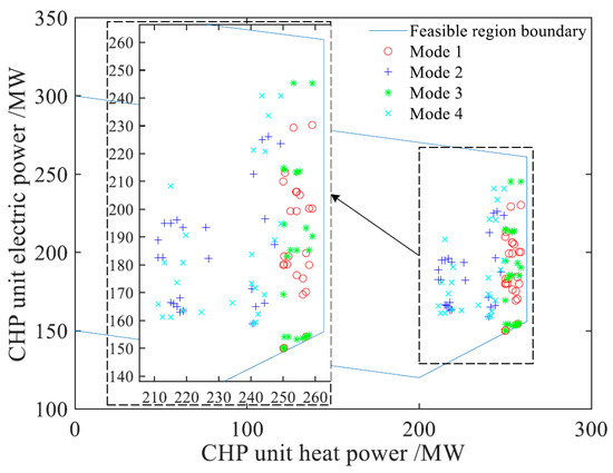 Figure 6 displays the distribution of operating points of the CHP units for 24 time periods in different modes. It can be seen that the operating points of modes 2 and 4 with the addition of EB have a wider distribution in the horizontal direction. The operating points of modes 3 and 4 with optimal control considered have more operating points near the upper and lower boundaries in the longitudinal direction, and the distribution is also wider. This phenomenon is because the CHP unit’s optimal control strengthens its electrical power ramping ability, while the EB relieves the “determining power generation by heat” restriction so that the unit can operate with less heat power. Therefore, the CHP unit has more room for power optimization, thus verifying better operational flexibility.