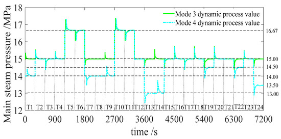 During the execution of the scheduling scheme, the main steam pressure variation of the CHP unit is related to the safe and stable operation. As shown in Figure 8, the maximum peaks of upward fluctuations were 17.37 MPa and 15.73 MPa, and the maximum peaks of downward fluctuations were 16.07 MPa and 14.36 MPa, respectively, when the main steam pressure was set at 16.67 MPa and 15 MPa in mode 3. During the regulation process, the pressure did not exceed the fluctuation range of of the set value, and all reached the set value at a steady state. In mode 4, the set value of the main steam pressure of the CHP unit changes with the change in working conditions. According to the change of working conditions, set the pressure steady-state value to 16.67 MPa, 15 MPa, 14.5 MPa, 14 MPa, 13.5 MPa, and 13 MPa, respectively. The maximum upward and downward peak fluctuations of the main steam pressure at different setting values did not exceed the fluctuation range of , and all reached the setting value at a steady state. The simulation proves that the pressure fluctuations caused by the optimized control process of the CHP unit do not affect the safe and stable operation of the unit.