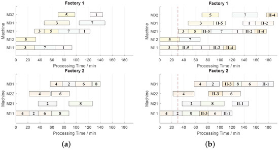 The Gantt chart of a solution of an instance with , , , , and is illustrated in Figure 1. The original schedule for is shown in Figure 1a; it can be seen that job 1 and job 7 in factory 1, as well as job 8 in factory 2 are unprocessed when new order arrives at . Thus, the three unprocessed jobs along with jobs in are rescheduled, while job 1 and job 7 still remain in factory 1 and job 8 in factory 2. The processing plan after rescheduling is shown in Figure 1b, in which the rectangles labeled II-1∼II-5 denote the jobs in . The makespan of and are 163 and 195 min, respectively, and the total energy consumption can be calculated as 134.08 kJ.