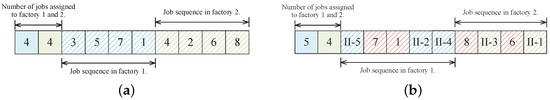For each job in EDHFRP, the factory assignment should be determined first, then a machine is selected for each stage, while the processing sequence on each machine should be determined at the same time. In this paper, the efficient and widely used permutation-encoding method is employed to represent the job sequence in each factory. Machine assignments are obtained through decoding operations according to the job sequence and factory assignment. Therefore, the solutions of EDHFRP can be encoded as , where denotes the number of jobs assigned to factories f, represents the processing sequence of jobs at the first stage in factory f. Considering the feasibility of the solutions, each job should occur in the job sequence of any factory once and only once.