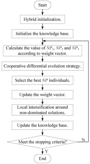 The framework of the proposed KCDE is depicted in Figure 3. Three differential evolution strategies are employed cooperatively on the knowledge base, and a self-adaptive weight vector is designed to control the proportion of the application of three strategies according to the quality of the offspring generated by them. Moreover, several problem-specific strategies, such as hybrid initialization, update of the knowledge base, and local intensification, are implemented. The performance of such a properly designed algorithm in solving EDHFRP is highly expected.