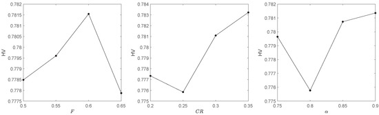 It can be seen from Table 3 that has the greatest influence on KCDE when solving EDHFRP in different scales, followed by and . As illustrated in Figure 4, denotes the proportion that the offspring learns from the trial individual rather than its parent, and a small value of may result in a rather slow evolutionary process. determines how much the knowledge base learns from the elite individuals in each generation; from the trend depicted in Figure 4, it can be seen that a small results in lower HV, which is caused by the loss of useful information. F controls the influence of parent vectors on the trial vector during differential mutation; a small F is more likely to decrease the diversity of the population, while the F of a too-large value will lead the population into slower convergence, as shown in Figure 4. Therefore, according to the analysis above and the results in Table 3, , , and are used in the following tests and experiments.