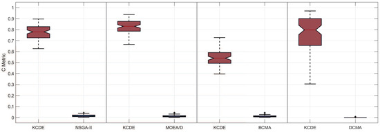 Boxplots of C Metric of KCDE, NSGA-II, MOEA/D, BCMA and DCMA.
