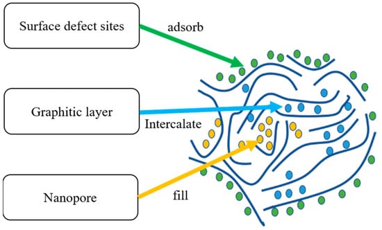 The main structures of HC are surface defects, graphitic domains, and nanopores [12]. The graphitic domains are mainly determined by the following three parameters: (1) the crystal thickness along the c-axis (Lc), (2) the crystal width along the a-axis (La), and (3) the d-spacing between graphene layers (d002) [17]. The XRD results are generally used to calculate these three parameters [34]. The nanopores of HC are divided into open and closed pores. They can be characterized by the micropore volume (V) and specific surface area (SSA) evaluated by the BET analysis. Defects in HC include pores in the bulk, dangling bonds, sp3-hybridized carbon bonds, and surface functional groups. Raman spectroscopy is widely used to detect the structure of carbon material. There are 2 main Raman bands for HC materials, namely the D peak between 1320 cm−1 and 1365 cm−1 and the G peak between 1520 cm−1 and 1600 cm−1. The intensity or integrated area ratios (ID/IG) represent a measure of material defects and disordered structures [38]. However, there are no suitable parameters to quantitatively analyze surface functional groups. The sodium storage mechanism in HCs has been continuously updated since the ‘house of card’ model proposed by Steve et al. [39]. So far, the following four main storage models have been suggested: (1) an intercalation–pore filling model, (2) an adsorption–intercalation model, (3) an adsorption–pore filling model, and (4) an adsorption–intercalation–pore filling model [11]. Although there is no definite storage model, all of these models include three types of sodium ion storage in HC, as shown in Figure 1: (1) Na+ ions adsorb at the defect sites on the surface; (2) Na+ ions intercalate into graphitic layers; and (3) Na+ ions fill the nanopores [40]. Overall, it can be concluded that the sodium-ion storage mechanism is closely related to the HC structure. As a result, an optimized biomass carbonization process plays a key role in the synthesis of HCs with a higher sodium storage capacity.