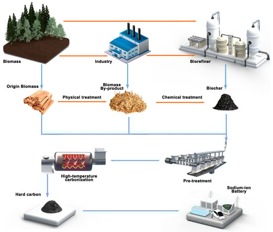 Biochar, a product from biomass pyrolysis [60], is one of the commercial products that is of interest as a precursor to produce HCs. Advantages of the use of biochar include safe raw material supply and high carbon efficiency. Both types of biomass mentioned above can be used in biorefineries and obtain the corresponding biochar products [61]. Compared to biomass and biomass by-products, biochar has a higher carbon content (>70%) after the pyrolysis process (300–900 °C) [60]. This means that there is a higher yield of HC in the carbonization process and fewer by-products (syngas, bio-oil), which reduces the waste treatment process and improves the economics. Moreover, the two-step heat treatment process also increases the graphitization of the HC, thus improving the performance of the HC anode [62]. However, biochar, as an energy product, is currently more expensive on the market, at around 200–500 USD/t [63]. Meanwhile, after carbonization, the HC structure still retains a certain degree of similarity to the precursor [32]. Rios used biochar from four biomasses with similar C (50%), H (6%), and O (41%) contents as HC precursor materials. HC anodes with different electrochemical properties were obtained under the same conditions, including: pine (323.8 mAh/g, 85%), ash wood (280 mAh/g, 79%), miscanthus (274.9 mAh/g, 80%), and wheat straw (224.4 mAh/g, 65%) [64]. This means that the raw material for biochar still has a significant impact on HC performance.
