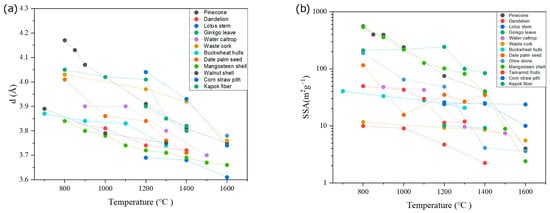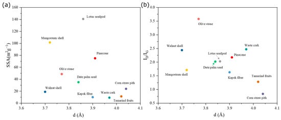 Hard carbon structure properties for different biomasses tested using the same condition (1200 °C for 2 h), including the relationship between d-spacing and (a) SSA, and (b) ID/IG. (Pinecone [56]; Mangosteen shell [57]; Lotus seedpod [58]; Waste cork [59]; Olive stone [78]; Walnut shell [79]; Kapok fiber [80]; Date palm seed [81]; Corn straw pith [82]; Tamarid fruits [83]).