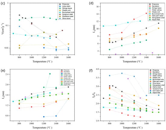 Effect of the carbonization temperature on hard carbon structure: Effect of the carbonization temperature on (a) d002; (b) SSA; (c) V; (d) La; (e) Lc; and (f) ID/IG [55,56,58,59,81,84,88,89,90,91].