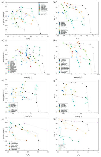 Relationship between hard carbon anode capacity and: (a) d002; (c) SSA; (e) Vt; (g) ID/IG ratios; Relationship between hard carbon anode ICE and: (b) d002; (d) SSA; (f) Vt; (h) ID/IG ratios [55,56,57,58,59,78,79,80,81,82,83,84,88,89,90,91].
