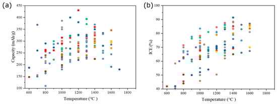 The relationship between carbonization temperature and HC anode performance: (a) capacity; (b) ICE. Different colored dots represent different biomass precursor [21,47,55,56,57,58,62,64,78,79,81,82,83,84,91,92,93,94,95,96,97,98,99,100,101,102,103,104,105,106,107,108,109,110,111,112,113,114].
