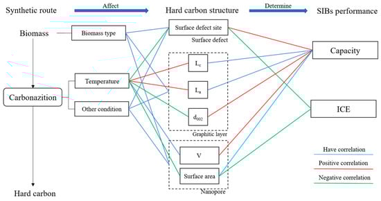 Figure 8 summarizes the relationship between the synthetic route, HC structure, and anode performance. The biomass precursors directly determine the structure of the HC. Different synthesis conditions can be used to further optimize the HC structure to achieve a better electrochemical performance. In the figure, the blue line represents the two parameter having a correlation, the red line represents a positive correlation, and the green line represents a negative correlation. It can be seen that an increased carbonization temperature will lead to reduced surface defects and SSA value, which will increase ICE. However, an excessive increase in the carbonization temperature will reduce graphite layer spacing, thus reducing the HC anode capacity. This corresponds to the trend in the data shown in Figure 7.