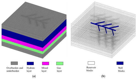 The geological parameters of the gas hydrate reservoir for the second trial test in the Shenhu area of South China Sea were investigated, and the values of main parameters were shown in Table 1 [17]. The gas hydrate reservoir in the test production area contains three main horizons, namely, the hydrate layer, mixed layer, and gas layer. As shown in Figure 3a, the hydrate layer is saturated with water and hydrate, the mixed layer is saturated with water, hydrate, and gas, and the gas layer mainly contains gas and water. Considering that generated gas and free gas are easy to migrate to the top of the reservoir and form a secondary gas top after depressurized development, fishbone wells are arranged in the hydrate layer in order to improve gas recovery, as shown in Figure 3b. The fishbone well was produced with a constant bottomhole pressure of 4 MPa, and the simulated production time was 1000 days. The maximum timestep is 10 days and the convergence criteria is that the differences of the primary variables between two Newton iterations are all smaller than 1 × 10−5.