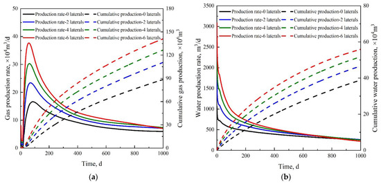 (a) Gas production, (b) water production. Production of fishbone well with different branches using depressurization.