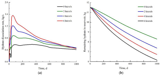 Figure 5 shows the rate of hydrate dissociation and the mass of the hydrate remaining for each scenario. As can be seen in Figure 5a, the rate of hydrate dissociation is low at the beginning of the depressurization development and rises rapidly with decreasing reservoir pressure and reaches a peak. In the later stage of depressurization development, the difference between hydrate dissociation rates of various schemes decreases. Comparing the scenarios, it can be seen that the higher the number of branches in the fishbone well, the higher the peak hydrate dissociation rate. However, at the same time, the rate of hydrate dissociation decreases rapidly due to the heat absorption by hydrate dissociation and therefore the reservoir heat is consumed heavily in the later stages of the buck development. The more branches there are, the more heat energy is consumed by hydrate dissociation, and the faster the hydrate dissociation rate decreases in the late stage of depressurization development. It can be seen in Figure 5b that the initial hydrate mass is 1.15 × 109 kg. At the end of the simulation, the remaining hydrate mass corresponding to the four schemes is 8.29 × 108 kg, 7.37 × 108 kg, 6.72 × 108 kg, and 6.15 × 108 kg, respectively. The dissociation rates of the hydrate are 27.9%, 35.9%, 41.6%, and 46.5%. It can be seen from these results that the more branches of the fishbone well, the higher the hydrate dissociation rate, but the hydrate dissociation rate of all schemes is lower than 50%. In the later stage of depressurization development, the combined development method of heat injection and depressurization is expected to further provide sufficient heat energy for the hydrate dissociation and promote the hydrate dissociation.