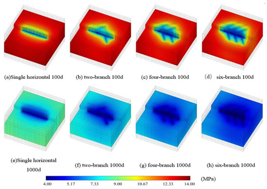 Pattern of change in gas and water production is consistent across the scenarios. As shown in Figure 4, in the initial stage of depressurized development, the gas production was low, but with the development of depressurized development, the daily gas production increased rapidly and then declined after reaching the peak. The larger the number of branches, the larger the peak gas production. For water production, the highest was in the initial stage of depressurization development, and then it continuously decreased. The more branch water, the higher the water production. This is mainly because the larger the number of branches, the larger the contact area between the fishbone well and the reservoir, and the faster the free water in the reservoir at the beginning of depressurization development. The cumulative water production of the four schemes within 100 days was 64,742 m3, 92,858 m3, 118,683 m3, and 144,488 m3, respectively. Compared with a single horizontal well, the initial water production of the six-branch fishbone well increased by 123.2%. Obviously, the faster free water production rate will greatly accelerate the depressurization rate of the reservoir. When the reservoir pressure around the wellbore drops to the equilibrium pressure of the hydrate phase, the hydrate begins to decompose and the dissociation gas begins to be produced in large quantities. In addition, after the reservoir pressure drops, the free gas in the mixed and free gas reservoirs starts to return upward. The faster the reservoir pressure drops, the faster the free gas returns upward. Therefore, the more branches of fishbone wells, the faster the gas production rate. The cumulative gas production of unbranched, double-branched, four-branched, and six-branched fishbone wells is 8.85 × 107 m3/d, 1.11 × 108 m3/d, 1.27 × 108 m3/d and 1.41 × 108 m3/d, respectively. Compared with a single horizontal well, the cumulative gas production of six-branched fishbone wells can increase by 59.3%. Therefore, the exploitation of Class I gas hydrate reservoir with multi-branch fish spur depressurization can effectively improve the productivity and depressurization development effect.