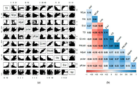 Correlation analysis of hydraulic breaker parameters as: (a) a scatter plot of the correlation coefficient; (b) a value of the correlation coefficient.