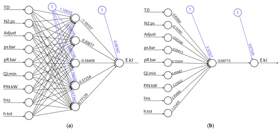 Moreover, the variables were used as hidden layers. The number of hidden layers were applied from 0 to 18. The hyper-parameter, which varies with the number of layers, neurons, nonlinear activation functions, and so forth for random search (RS), is a family of numerical optimization methods that do not require the gradient of the problem to be optimized, and RS can hence be used on functions that are not continuous or differentiable. Such optimization methods are further known as direct-search, derivative-free, or black-box methods [20]. The hidden layer uses backpropagation to optimize the weights of the input variables to improve the predictive power of the neural network model. The NNMM models outperformed all the other models, including the neural network regression Gaussian normalizer and linear regression [21]. In terms of accuracy, the NN-GAU models were second only to the linear regression model. The NN-MM model exhibited the lowest accuracy in predicting the impact energy of small-scale hydraulic breakers. After training all models using training data from the hydraulic breaker performance data, we proceeded with invisible data for the predictive testing of the models. As can be seen in Figure 5, the hidden layer sample of the test data set for the two models is based on the hydraulic breaker neural network model. Again, the NN-MM models showed higher R2 values for the small-to-medium-class hydraulic breakers (SM-HB) data set compared to the data set for all stations. The small-class hydraulic breakers had an R2 value of 0.9451, while the large-class hydraulic breaker data set had an R2 value of 0.8913.