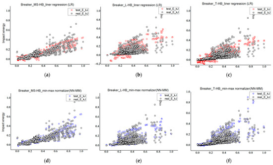 The figures of merit for the training data sets of the two models are based on the two performance indicators for the small-to-medium-class hydraulic breaker (SM-HB) and the large-class hydraulic breaker (L-HB), as shown in Table 4. The model shows that high-level coefficients of determination (R2) values were obtained for all performances when only small-scale hydraulic breakers were considered instead of the large-class breaker data set. The small-class hydraulic breaker data set R2 values for (LR) was 0.88079, (NN-MM) was 0.94510, and (NN-RGU) was 0.93796, whereas the R2 values for the large-class hydraulic breaker data set was (LR) 0.84111, (NN-MM) 0.89130, and (NN-RGU) 0.92404. Therefore, a compact hydraulic breaker helps predict the impact energy, which is a performance indicator; this explains why the small-scale hydraulic breaker model outperformed the large-scale hydraulic breaker model. In addition, the root mean square error (RMSE) and other performance indicators are presented in Table 4.