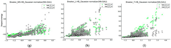 Scatter plot of predicted versus measured impact energy of a hydraulic breaker as: (a) linear regression model (LR) of small-to-medium-class hydraulic breaker data set (MS–HB); (b) large-class hydraulic breaker data set (L–HB); (c) total size class data set (T–HB); (d) neural network min–max normalizer model (NN-MM) of small-to-medium-class hydraulic breaker (MS–HB) data set; (e) large-class hydraulic breaker data set; (f) total size class data set; (g) neural network Gaussian normalizer model (NN–GAU) of small-to-medium-class hydraulic breaker (MS–HB) data set; (h) large-class hydraulic breaker data set; (i) total size class data set.