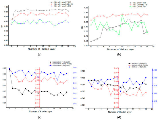 The coefficient of determination and root mean square error (RMSE) of neural network Min–Max normalized versus neural network Gaussian normalized model for hidden layer number: (a) coefficient of determination of neural network Min–Max normalized (NN-MM) for hidden layer number; NN-MM total size class (T-HB), small-to-medium-class (MS-HB) and large-class hydraulic breakers (L-HB); (b) coefficient of determination of neural network with Gaussian normalized (NN-GAU) for hidden layer number; NN-GAU total size class (T-HB), small-to-medium-class (MS-HB) and large-class hydraulic breakers (L-HB); (c) root mean square error of NN mm for hidden layer number; NN mm total size class (T-HB), small-to-medium-class (MS-HB) and large-class hydraulic breakers (L-HB); (d) root mean square error of neural network with Gaussian normalized (NN-GAU) for hidden layer number; NN-GAU total size class (T-HB), small-to-medium-class (MS-HB) and large-class hydraulic breakers (L-HB).