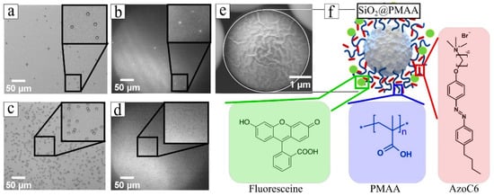 (a–d) Optical micrographs in transmission (a,c) and emission mode for silica colloids loaded with fluorescein and photosensitive surfactant: (a,b) SiO2@PMAA and (c,d) SiO2. (e) SEM micrographs of SiO2@PMAA coated with polymer layer. (f) Scheme of the PMAA (blue lines) spherical brush loaded with surfactant (red rods) and fluorescein (green spheres) and corresponding chemical structures of cationic azobenzene containing surfactant (C4-azo-OC6-TMAB, red), poly(methacrylic acid) chain (blue), and fluorescein (green).