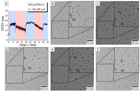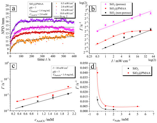 where NPDe and NPD0 are the nearest particle distance at the equilibrated and initial state, respectively, t the time, and Γ the characteristic separation rate. Doubling the intensity leads to an almost doubled separation rate, indicating that the DO is linearly proportional to the light intensity up to a critical intensity of 4 mW/cm² (Figure 3b). Beyond this intensity, the separation rate is effectively constant. Data measured for SiO2@PMAA are compared with data for porous (P-SiO2) and non-porous (SiO2) silica colloids of similar size but otherwise unmodified. The porous particles have a pore size of 6 nm and thus a much larger surface area compared to plain colloids. This results in a large amount of surfactant being absorbed by porous particles compared to plain SiO2 and spherical brushes (SiO2@PMAA). The separation takes place within seconds or minutes, depending on the light intensity or the particle type (Figure 3b). All particles show the same trend; with increasing intensity, an increase in the separation can be observed in the following order: P-SiO2 > SiO2@PMAA > SiO2, but without any pronounced velocity limitation at high intensities for SiO2 and P-SiO2 (Figure 3b).