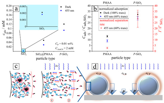 where kTC,I and kTC are the rate constants of trans−cis isomerization inside the microgel and bulk solution, respectively, kCT the rate constant of cis−trans isomerization in the bulk, cT,I the trans isomer concentration at the interface, cT,B and cC,B the concentrations of trans and cis isomers in the bulk, and I the intensity of the light. Here, we interpret the PE brush layer as a diffusive interface capable of absorbing a certain amount of trans isomers, larger than in the case of the plain particles (SiO2), but less than in the case of the porous colloids (P-SiO2) (see Figure 4a, where the adsorbed amount of the surfactant is shown for three different particles) (for calculations, see Section 4, Supporting Information). When exposed to blue light, more surfactants are released (creleased ~ cdark-cblue) from the P-SiO2 (creleased = 0.03 mM) than from the SiO2@PMAA (creleased = 0.02 mM) and fewer from the plain particles (creleased = 2∙10−4 mM). Furthermore, normalizing the adsorbed surfactant for the P-SiO2 and the SiO2@PMAA against the SiO2 shows that the P-SiO2 absorbs ~33 and the SiO2@PMAA ~12.5 times more surfactant in comparison to the SiO2 (dark state, Figure 4b), but under blue illumination (455 nm) the ratio is reduced for the P-SiO2 to ~29 and for the SiO2@PMAA to ~9, where the normalized separation Γ/ΓSiO2 (red data, Figure 4b) is congruent for the P-SiO2 ~28.6 but not for the SiO2@PMAA to be ~3 and therefore a factor 3 smaller than the value for adsorbed cads/cads,SiO2. Additionally, data in Figure 3b indicate a linear dependence between the DO flow strength and the surfactant storage capacity for porous silica particles (Equation (3)). For the SiO2@PMAA, in principle, all counterions can be replaced by the surfactant molecules, which leads to a strong collapse of the polyelectrolyte brush [46,47]. Thus, technically, a high amount of surfactant molecules can be stored within the PE, and much faster separation compared to plain silica particles should be expected. However, the data yield only three times faster separation (relative particle separation in Figure 4b). Thus, what is causing the pronounced exchange limitation of the isomers even at a high surfactant storage capability?