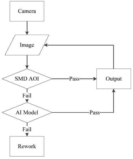 The aim of this research is to introduce deep learning technology into the original inspection process without changing the original AOI inspection method, so as to reduce the over-inspection rate of AOI machines. In the past, in order to improve the problem of a high over-inspection rate of AOI machines, the defect images judged by the machine were manually re-inspected. Determining how to effectively solve the problem of the high over-inspection rate of the original AOI machine is the purpose of this study. The PCB images collected in this study are all taken by the original AOI machines, including PCBs with defects and without defects. The images of defective products are sent to the AI model to perform the reinspection. The overall AI judgment process is shown in Figure 5.